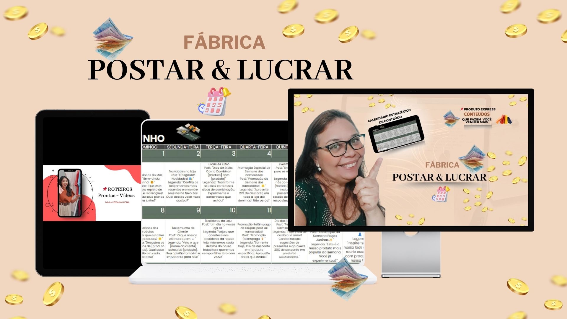 Com a Fábrica POSTAR & LUCRAR para Lojista, Sacoleiras, Revendedoras e Consultores de vendas direta que vivem no corre corre – mas não abrem mão de crescer no digital, recebe tudo pronto pra postar com leveza, constância e estratégia, mesmo sem entender nada de redes sociais.