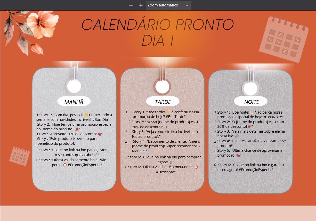 Ideias prontas de 18 postagens ao dia (6 manhã, 6 tarde e 6 à noite), que vai te ajuda a gerar engajamento real sem precisar pensar em como criar.